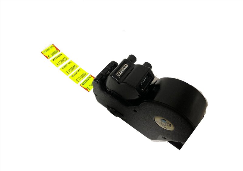Prezzatrice 2 righe di stampa. 1° riga cinghiettone 12 stampa (vedi foto allegata) 2° riga 7 cifre numeriche h 8 mm. Stampa su etichetta 37X28.